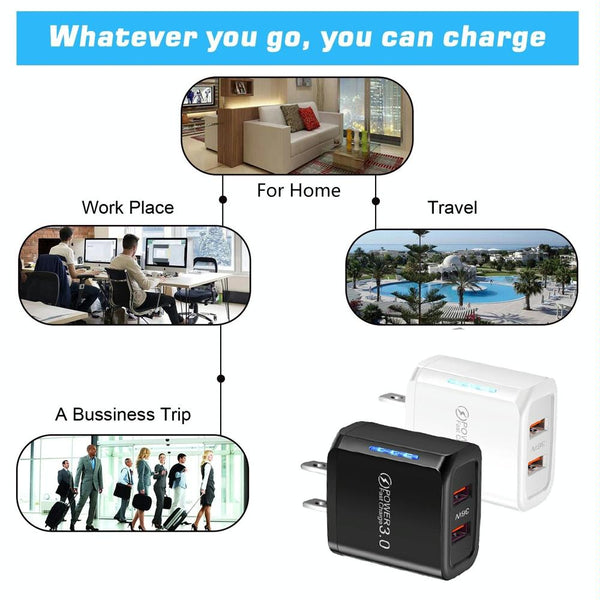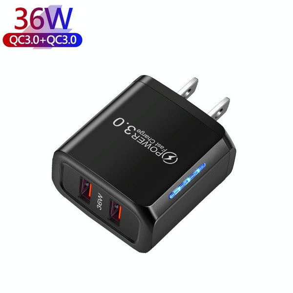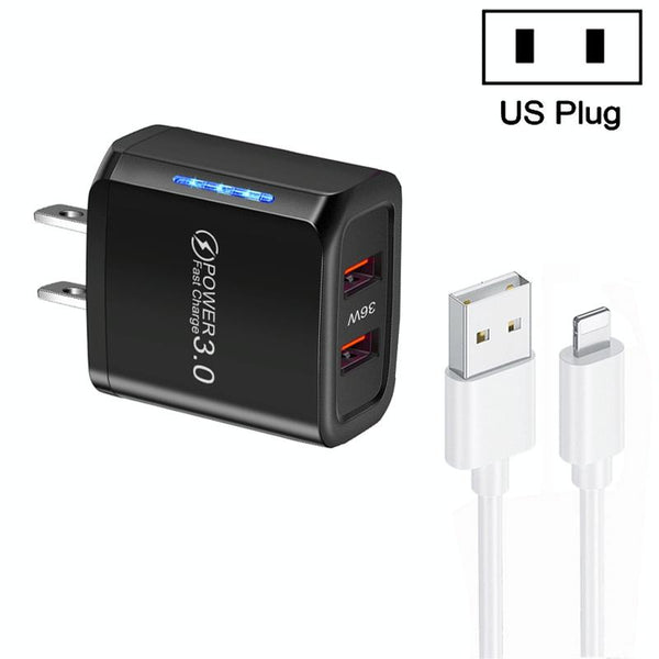 36W Dual Port QC3.0 USB Charger with 3A USB to 8 Pin Data Cable, US Plug(Black)