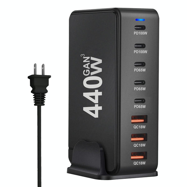 1. High-Output Multi-Port Charger: This 440W GaN charger can charge up to 8 devices simultaneously with its 5 USB-C ports and 3 USB-A ports. It delivers a maximum power of 440W, enough to power laptops, tablets, phones, and more.