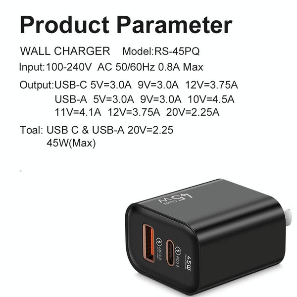 5. Dual port simultaneous: USB-C+USB-A/20V -2.25A, 45W max.