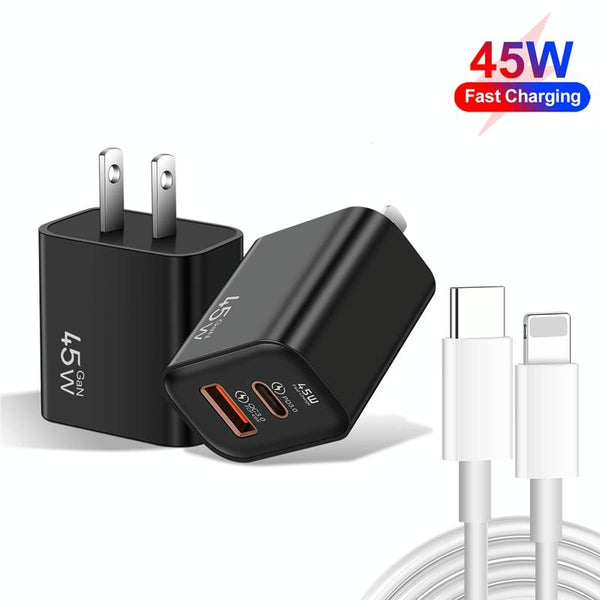 45PQ 45W PD25W + QC3.0 20W USB Super Fast Charger with Type-C to 8 Pin Cable, US Plug(Yellow)