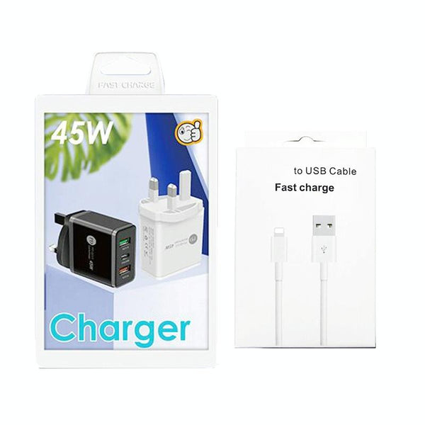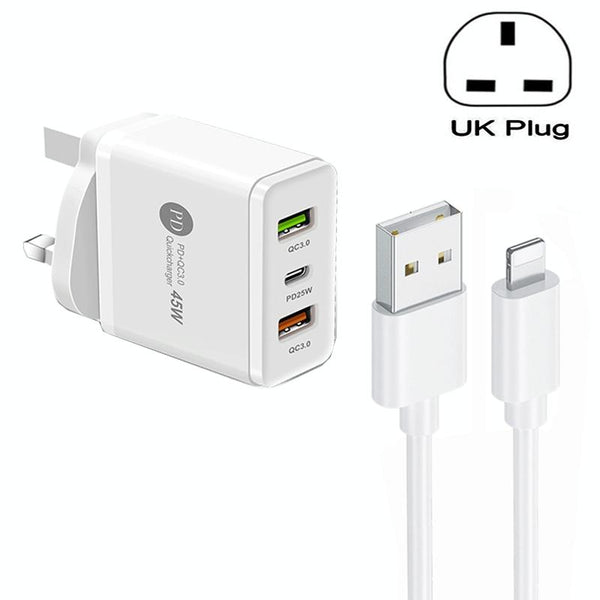 45W PD25W + 2 x QC3.0 USB Multi Port Charger with USB to 8 Pin Cable, UK Plug(White)