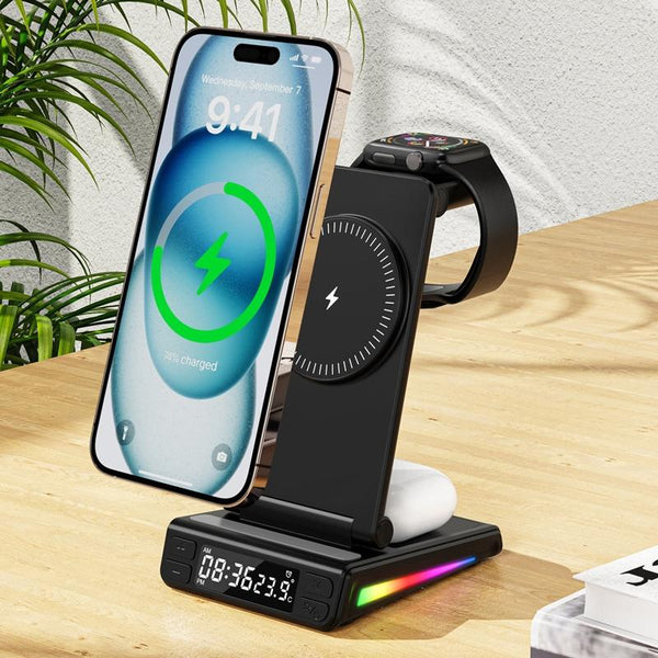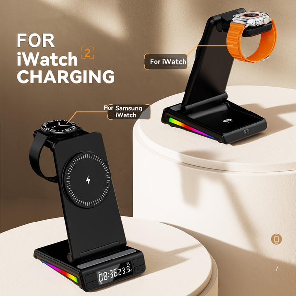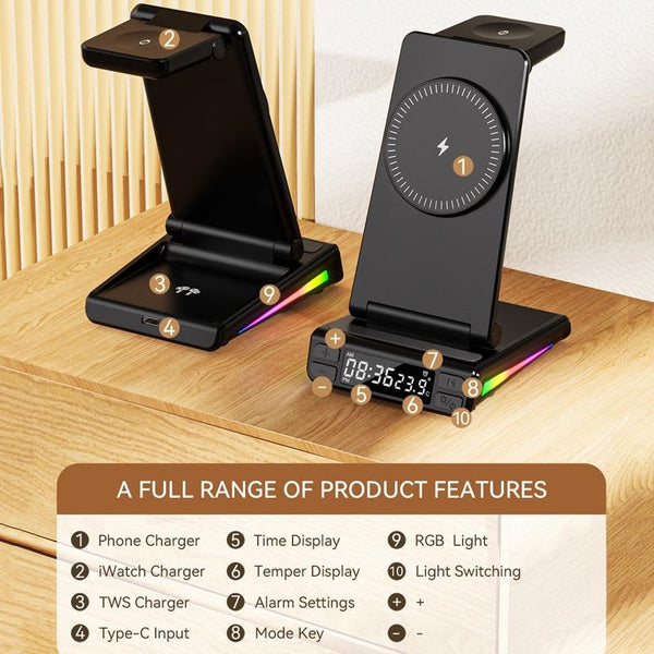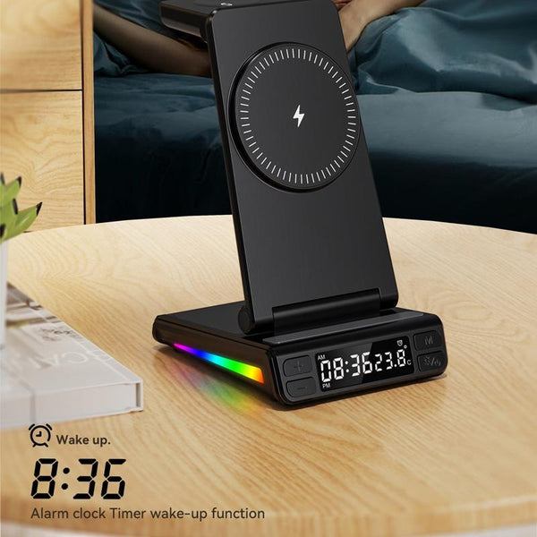 5-in-1 Desktop Magnetic Wireless Charger with Clock and Temperature Display for Smartphones / Watches / Earphones(White)