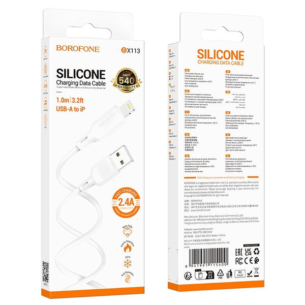BOROFONE BX113 2.4A USB to 8 Pin Silicone Charging Data Cable, Length:1m(White)