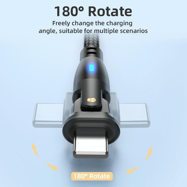 1. 180 Degree Rotating + Right Angle Head: This cable features a 180-degree rotating head, providing effortless flexibility and ensuring the longevity of this nylon-made cable. With safe charging capabilities that prevent overheating, you can charge your devices worry-free.