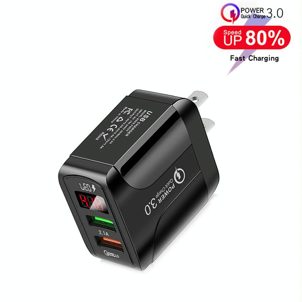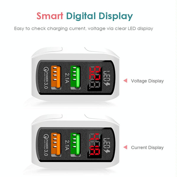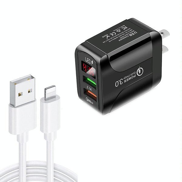 F002C QC3.0 USB + USB 2.0 LED Digital Display Fast Charger with USB to 8 Pin Data Cable, US Plug(Black)