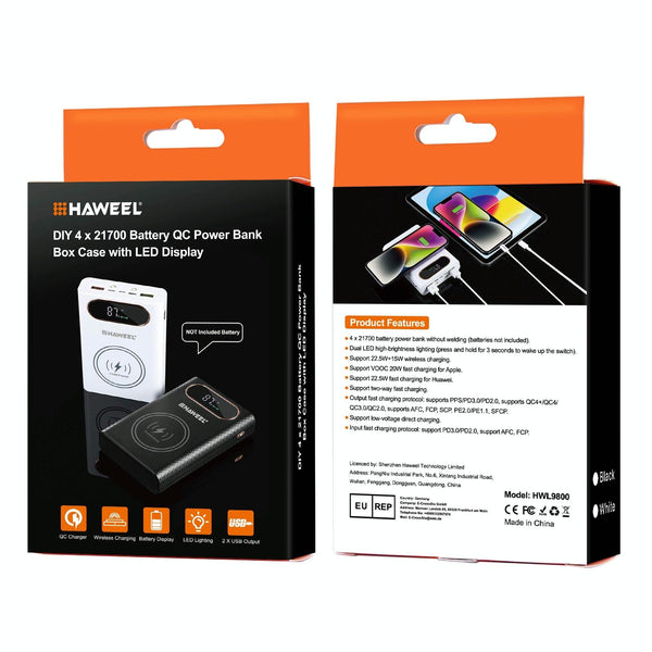 HAWEEL DIY 4 x 21700 Battery 22.5W Fast Charge 15W Wireless Charging Power Bank Box Case with Display, Not Include Battery (Black)