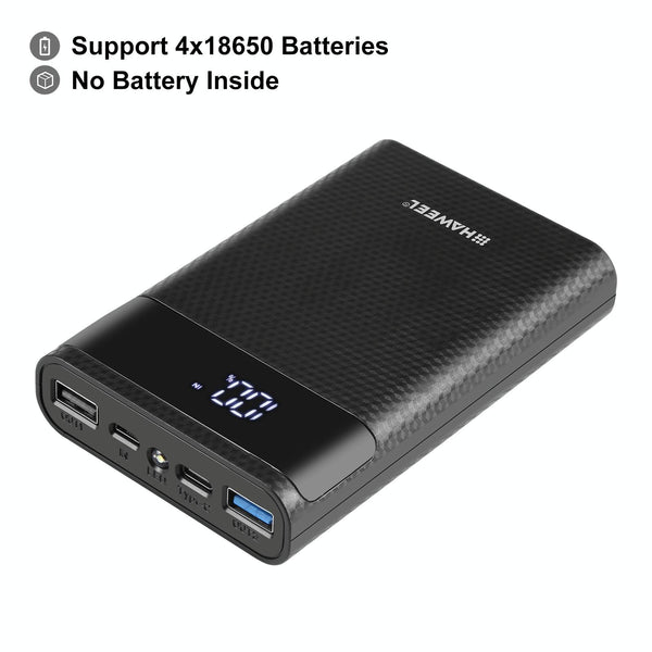 HAWEEL DIY 4x 18650 Battery (Not Included) 12000mAh Dual-way QC Charger Power Bank Shell Box with 2x USB Output & Display,Support QC 2.0 / QC 3.0 / FCP / SFCP /AFC / MTK / BC 1.2 / PD(Black)
