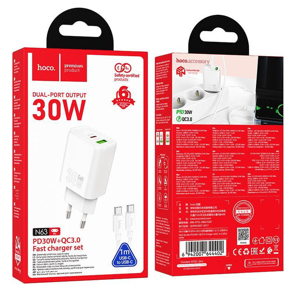 hoco N63 PD30W+QC3.0 Charger Set with 1m Type-C to Type-C Cable, Specification:EU Plug(White)