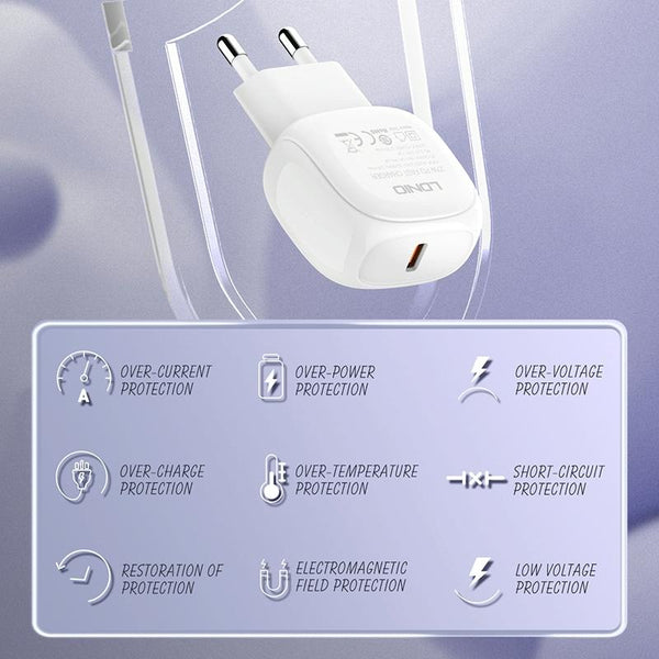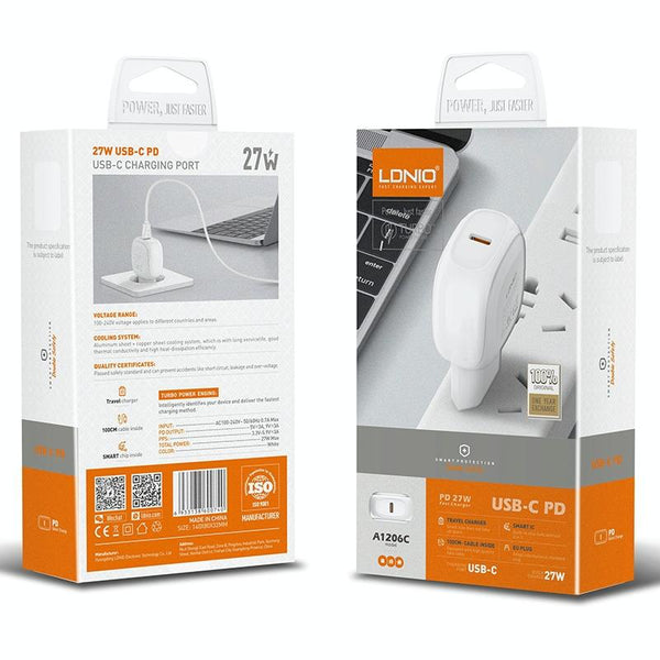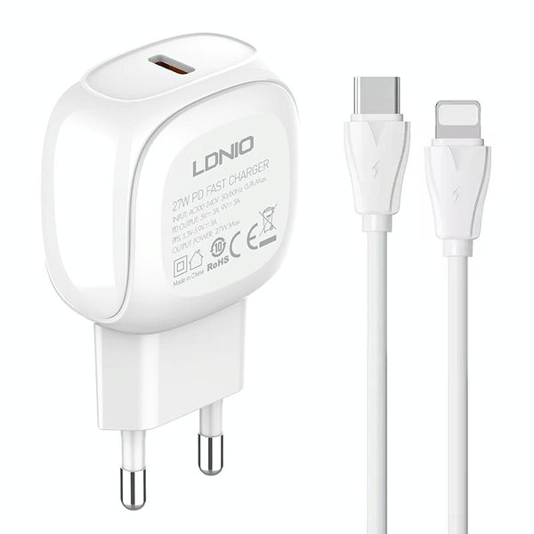 LDNIO A1206C PD27W USB-C / Type-C Fast Charger with 1m 8 Pin Cable, Plug Type:EU Plug(White)