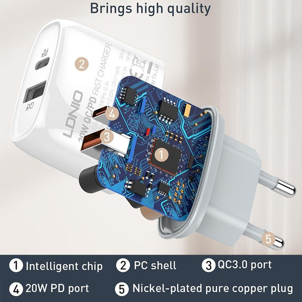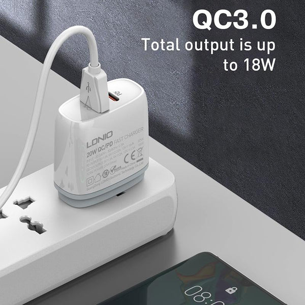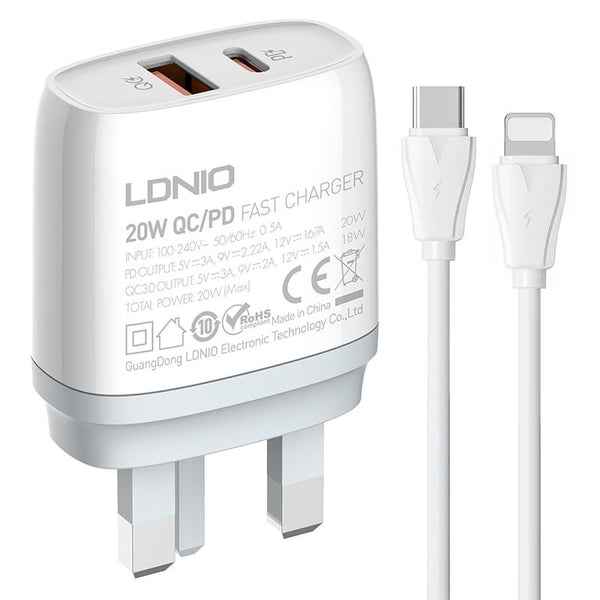 LDNIO Q229 QC3.0 / PD20W USB + Type-C Fast Charger with 1m Type-C to 8 Pin Cable, Plug Type:UK Plug(White)