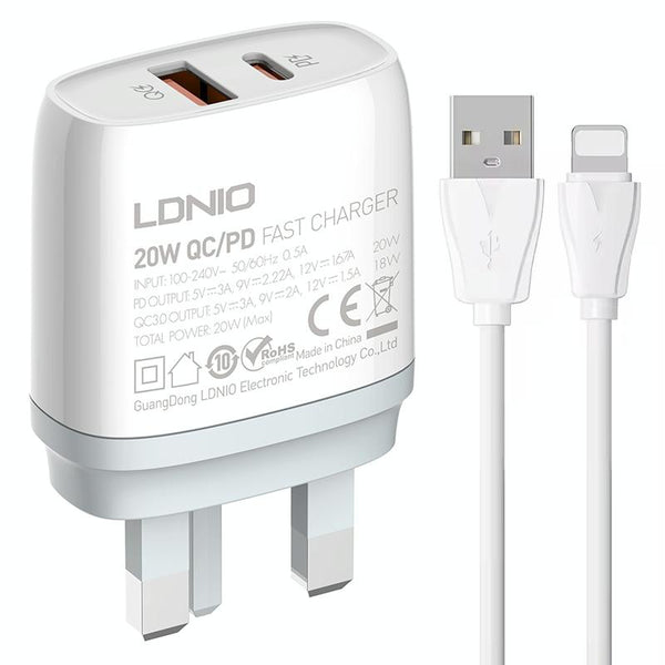 LDNIO Q229 QC3.0 / PD20W USB + Type-C Fast Charger with 1m USB to 8 Pin Cable, Plug Type:UK Plug(White)
