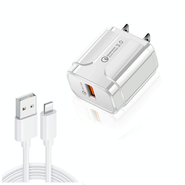 LZ-023 18W QC 3.0 USB Portable Travel Charger + 3A USB to 8 Pin Data Cable, US Plug(White)