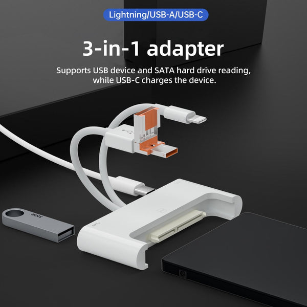 NK-1046TL Pro multi-function adapter is a converter specially developed for drama lovers and office workers who are accustomed to mobile hard drives. The adapter's Type-C, USB, and SATA interfaces allow users to easily back up files in the hard drive on mobile devices while ensuring the battery life of the device, watch audio and video, and expand the diversity of USB peripheral functions (the adapter needs to be plugged into the Type-C charging cable on the 8-pin device to operate the SATA interface).