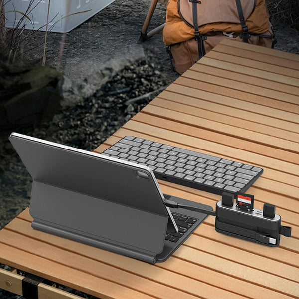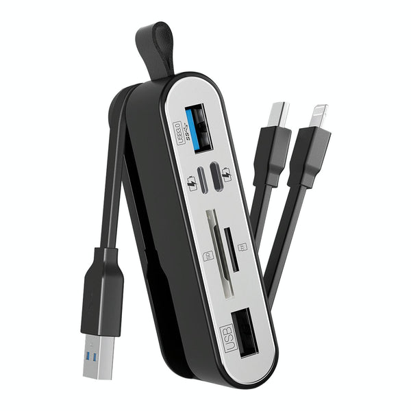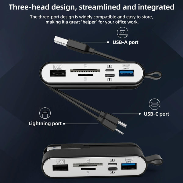 This 6-in-1 multifunctional adapter integrates 8 Pin, USB-C and USB-A. With its USB female socket and SD/TF card slot, it can seamlessly connect and transfer data between devices with three different interfaces, easily achieving data sharing and efficient exchange. In addition, it also has an 8 Pin female socket and a USB-C female socket, providing you with a stable and convenient charging experience, ensuring that your device always has sufficient power and is ready to respond to various needs at any time.