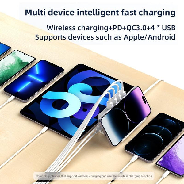 1. Support multi-device charging at the same time, 1 PD20W, 1 QC3.0 charging port, 4 5V 2.4A charging ports, 1 wireless charging