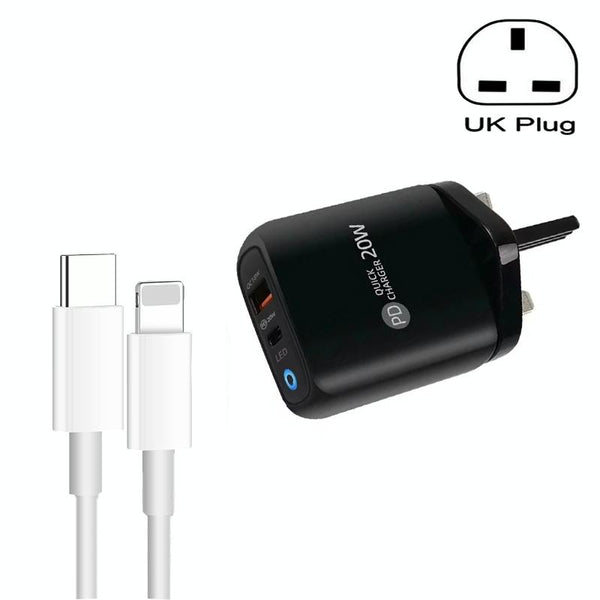PD04 Type-C + USB Mobile Phone Charger with Type-C to 8 Pin Cable, UK Plug(Black)