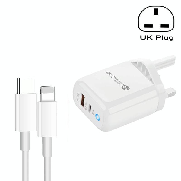 PD04 Type-C + USB Mobile Phone Charger with Type-C to 8 Pin Cable, UK Plug(White)