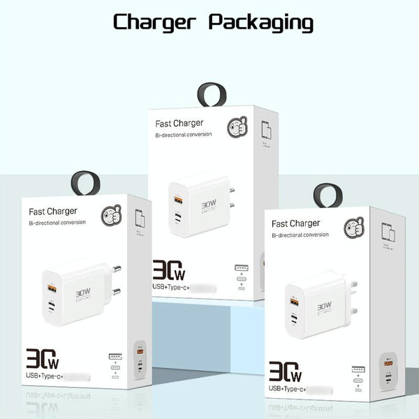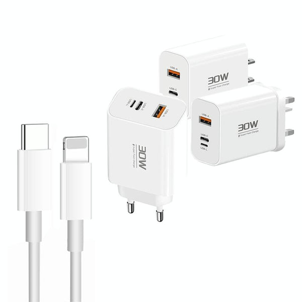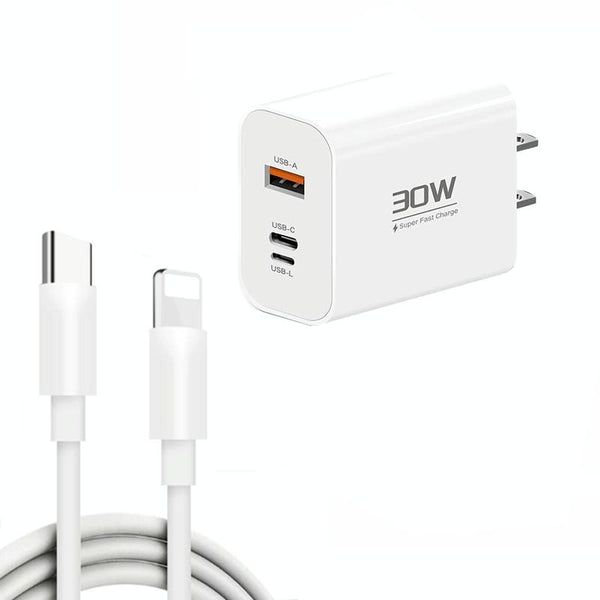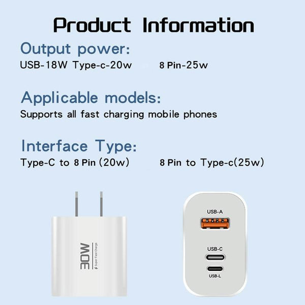 PD30W USB-C / Type-C + 8 Pin + USB Charger with Type-C to 8 Pin Date Cable(US Plug)
