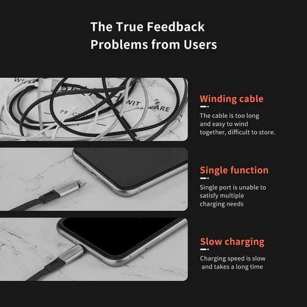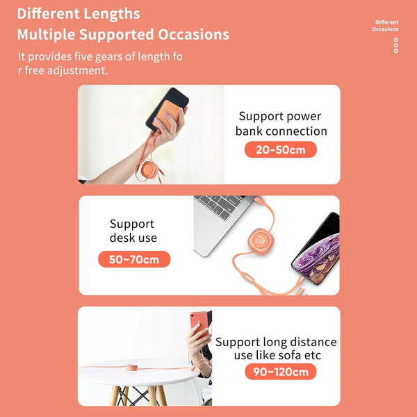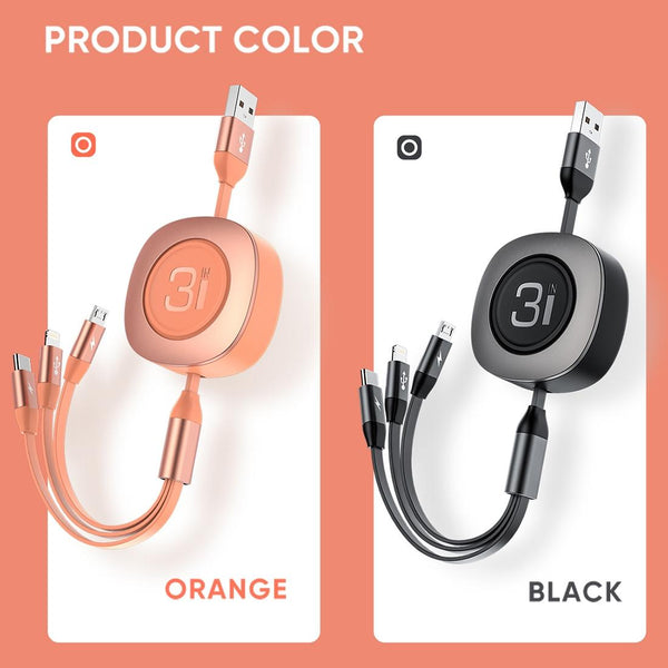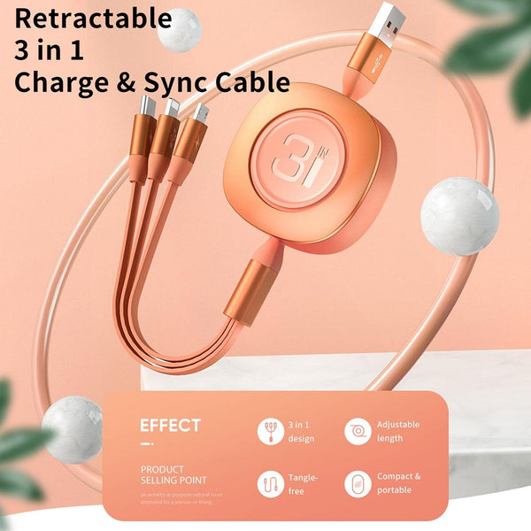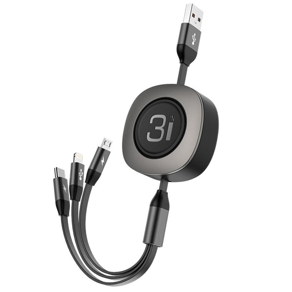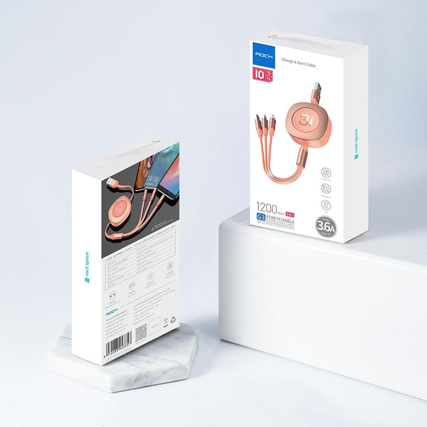 ROCK G3 5V 3.6A 3 in 1 8 Pin + Micro USB + USB-C / Type-C Retractable Fast Charging Data Cable, The Maximum Length: 1.2m(Black)