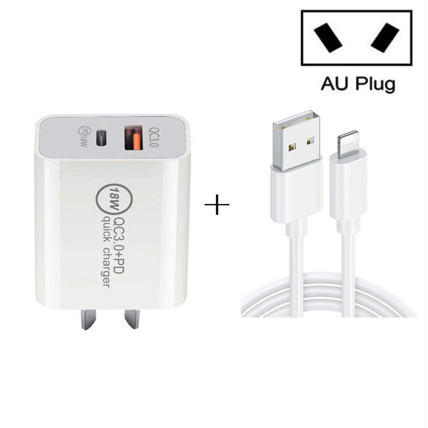 SDC-18W 18W PD 3.0 Type-C / USB-C + QC 3.0 USB Dual Fast Charging Universal Travel Charger with USB to 8 Pin Fast Charging Data Cable, AU Plug
