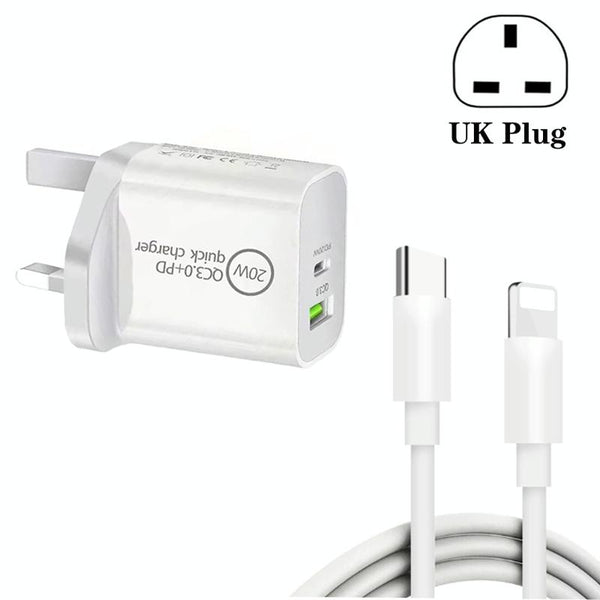 SDC-20WA+C 20W PD + QC 3.0 USB Dual Fast Charging Universal Travel Charger with Type-C / USB-C to 8 Pin Fast Charging Data Cable, UK Plug
