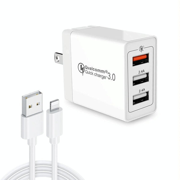 SDC-30W 2 in 1 USB to 8 Pin Data Cable + 30W QC 3.0 USB + 2.4A Dual USB 2.0 Ports Mobile Phone Tablet PC Universal Quick Charger Travel Charger Set,US Plug