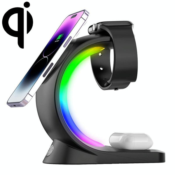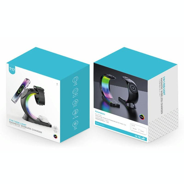 T17 3-in-1 RGB Atmosphere Light MagSafe Phone Watch Earphone Wireless Charger, Color: Black with UK Plug
