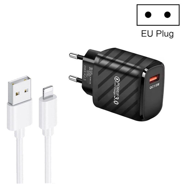 TE-005 QC3.0 18W USB Fast Charger with 1m 3A USB to 8 Pin Cable, EU Plug(Black)