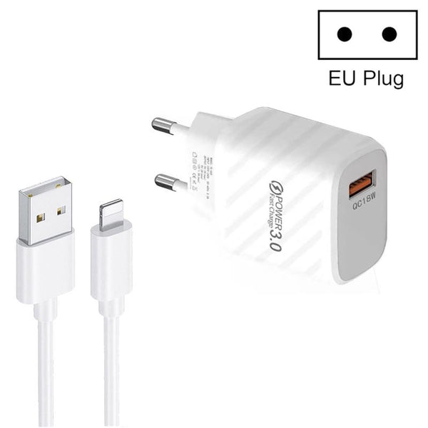 TE-005 QC3.0 18W USB Fast Charger with 1m 3A USB to 8 Pin Cable, EU Plug(White)