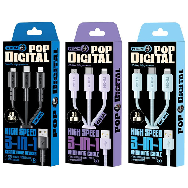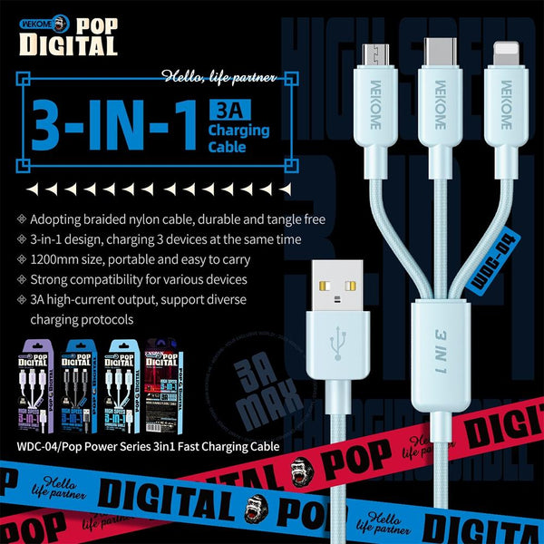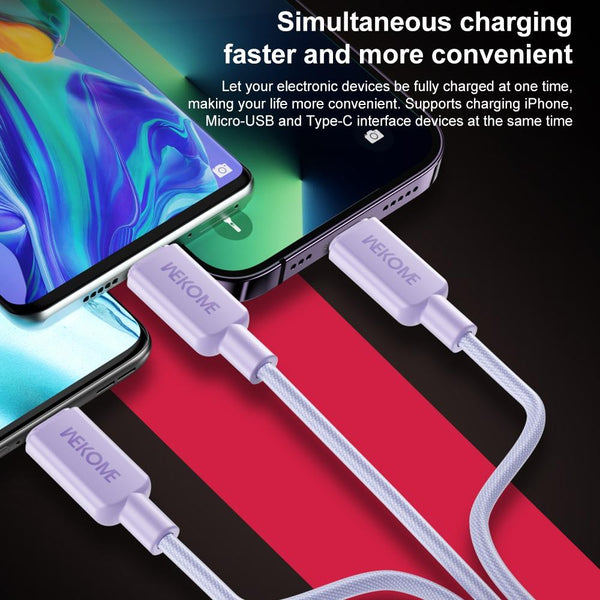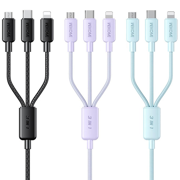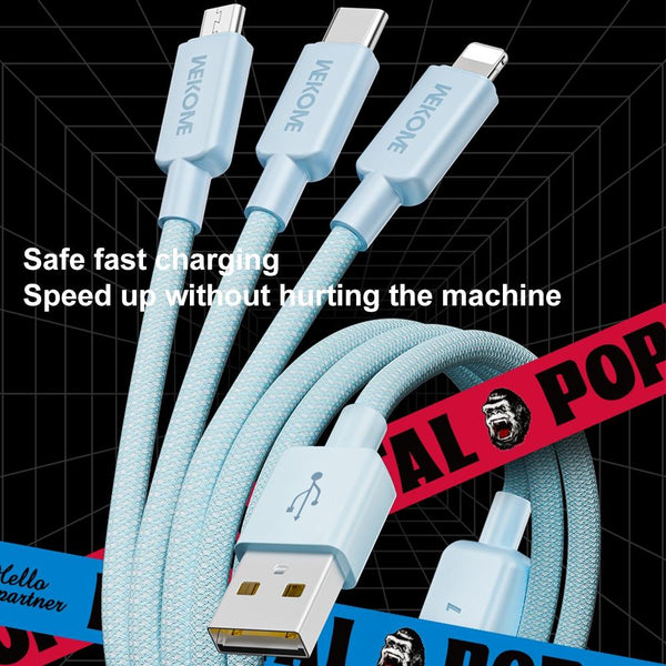 WEKOME WDC-04 Tidal Energy Series 3A USB to 8 Pin+Type-C+Micro USB 3 in 1 Braided Data Cable, Length: 1.2m (Blue)