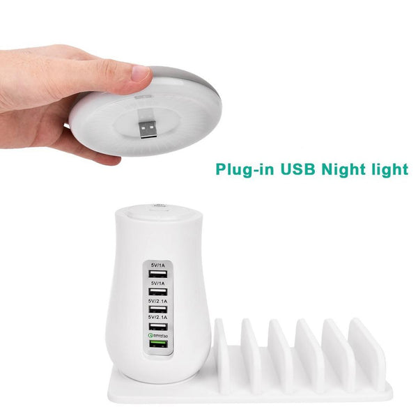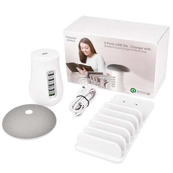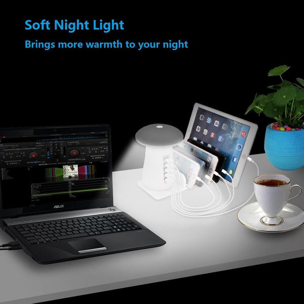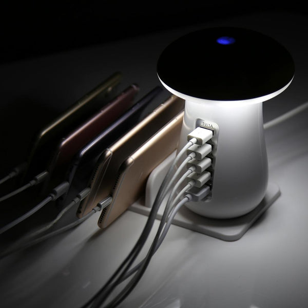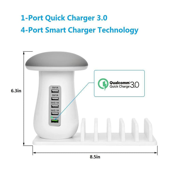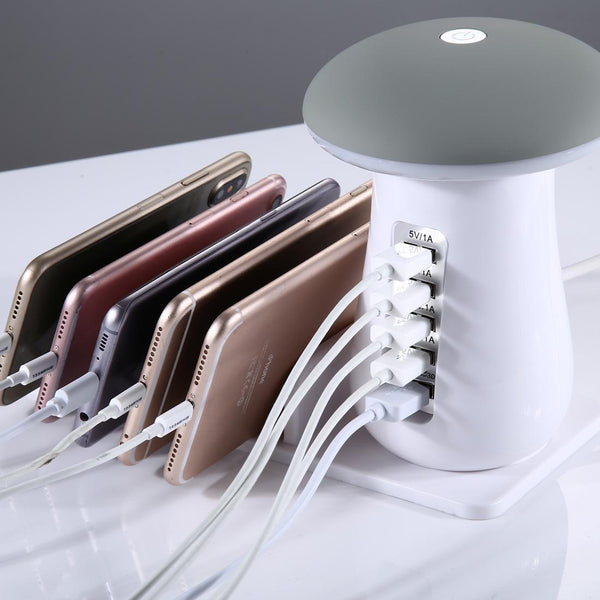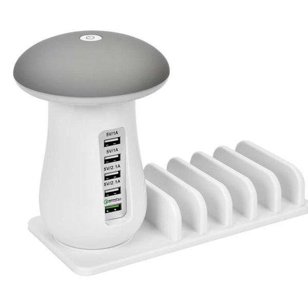 XLD888 5 Ports (2 x 5V/1A + 2 x 5V/2.1A + 1 x QC3.0) USB Charger Mushroom Light Desk Lamp Charger with Phone Holder