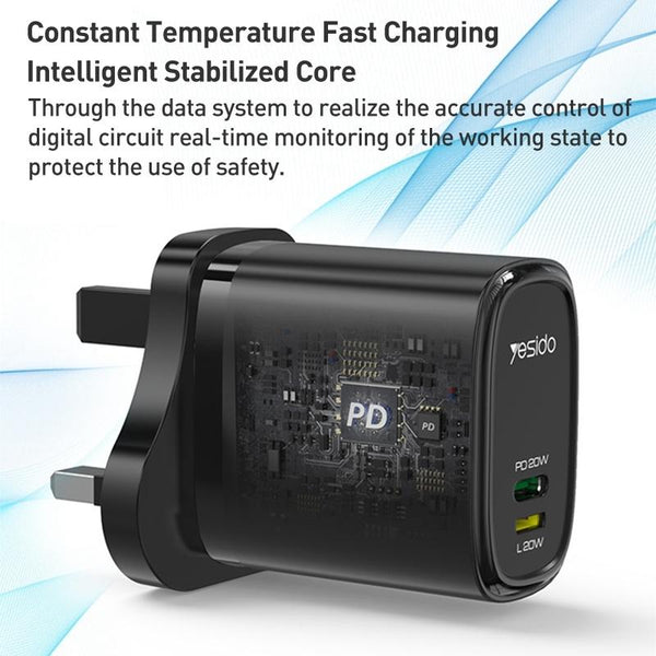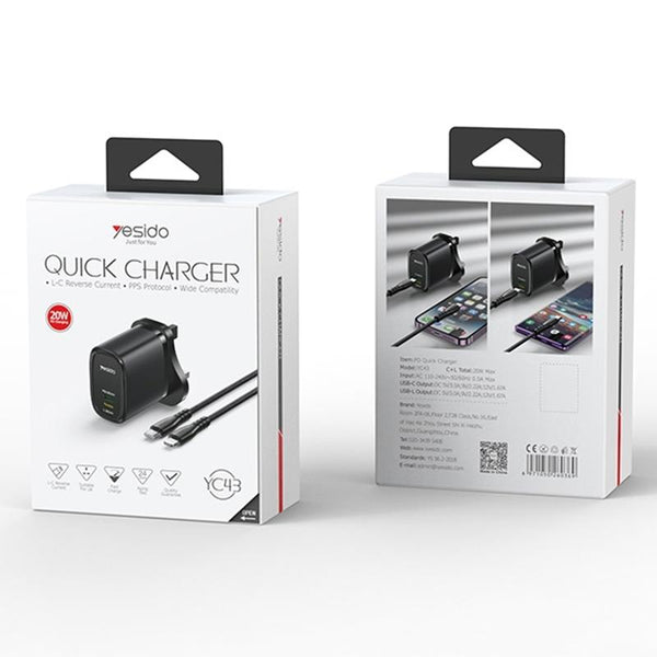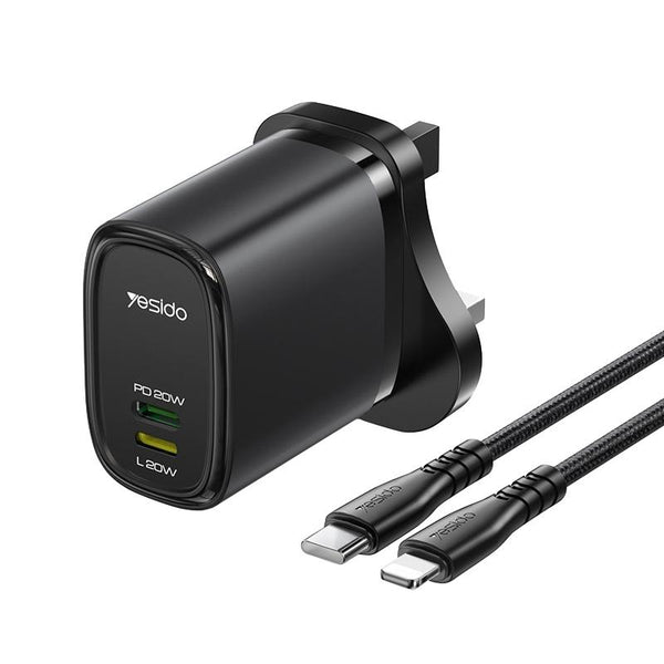 Yesido YC43 PD 20W USB-C / Type-C + 8 Pin Travel Charger with 1m Type-C to 8 Pin Cable, UK Plug(Black)