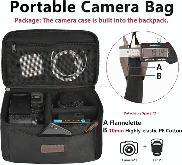 2. Laptop Backpack&Insert Camera Bag: There is a zipper compartment inside, which can divide the space of the backpack into upper and lower parts. It is made of water-repellent fabric, protecting your important things from getting wet in light rain. There is a 15mm thick removable camera liner bag inside, which can better protect your photography equipment. Take out the liner bag, the camera bag can be easily converted into a daily backpack.