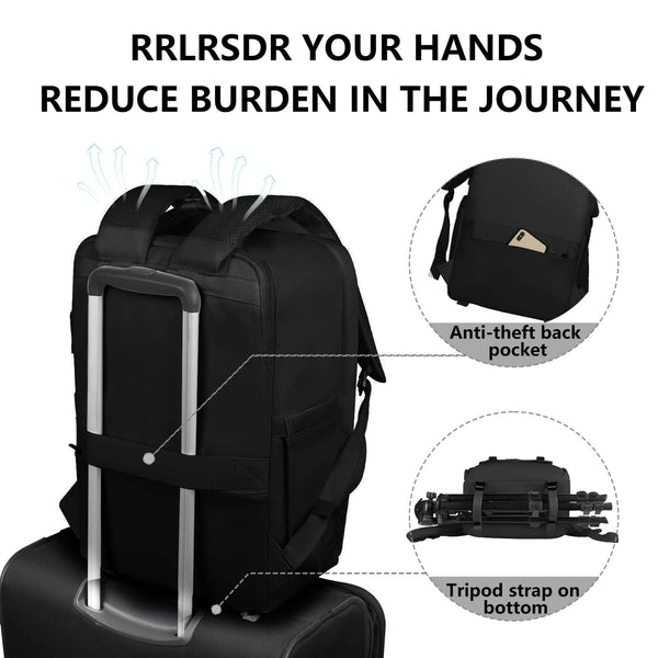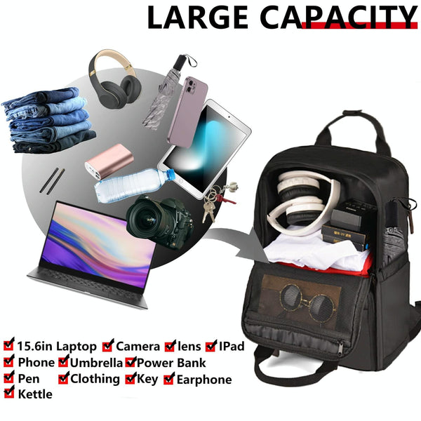 1. Large Capacity: This professional camera backpack is compatible with Canon Nikon Sony and other brand cameras; It holds and protects 1 SLR / DSLR camera body, 2 lenses, phone, charger, headphones, etc. It also can be used as laptop backpack for large storage and organization for small items, like 15.6 in laptop, tripod, ipad, water bottle, umbrella, clothes, travel accessories, books, stationery etc.