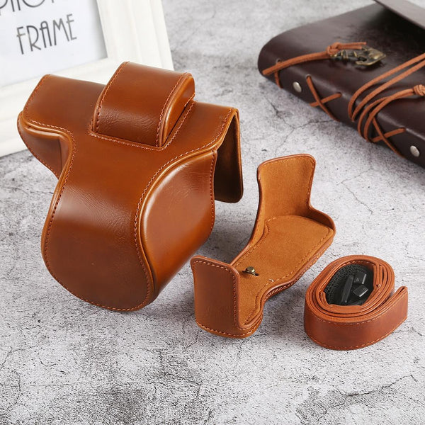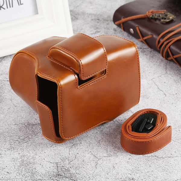 Oil Skin PU Leather Camera Full Body Case Bag with Strap for Olympus EM10 III(Brown)