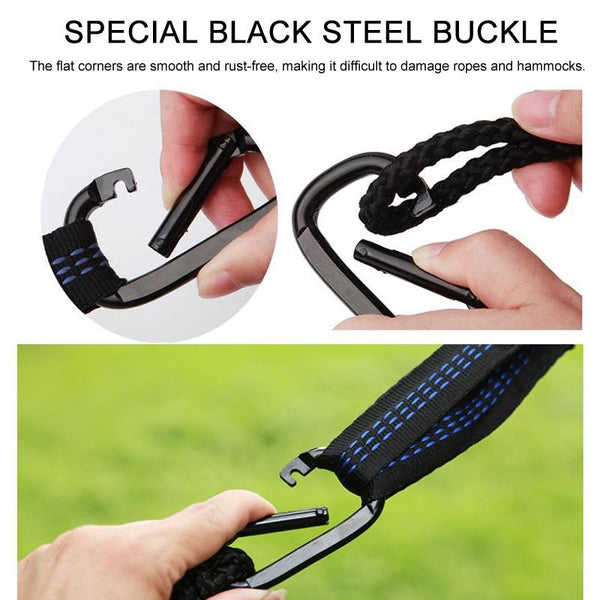 Included Accessories: 2 tree straps (each 2 meters long), 2 black steel carabiners, and 1 storage bag