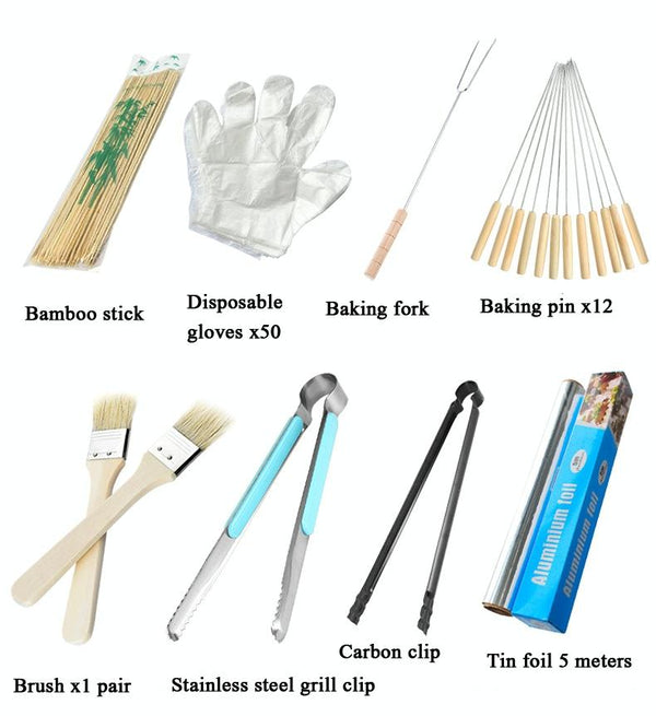 1. Contents: bamboo sticks (about 90 pieces), disposable gloves (50 pieces), thick baking forks, baking needles (12 pieces), brushes (2 pieces), stainless steel baking clips, carbon clips, tin foil (5 meters) )
