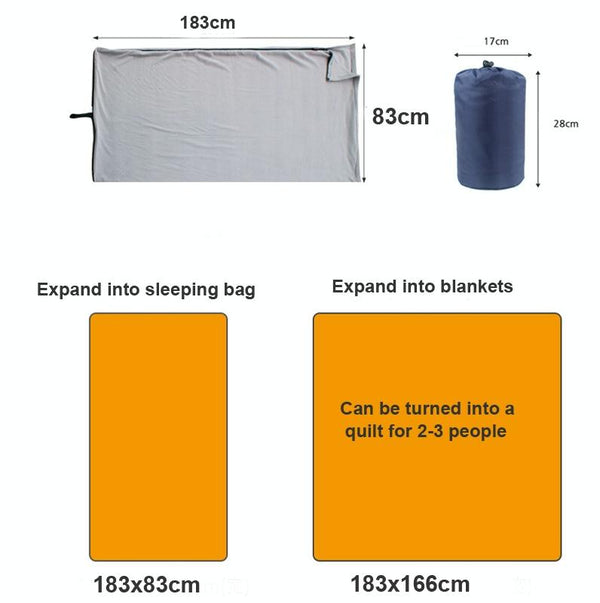 1. Size: Pack storage bag 28cm (height) X17cm (diameter); unfold into sleeping bag size 183cm (length) X83cm (width); unfold into blanket size 183cm (length) X166cm (width)