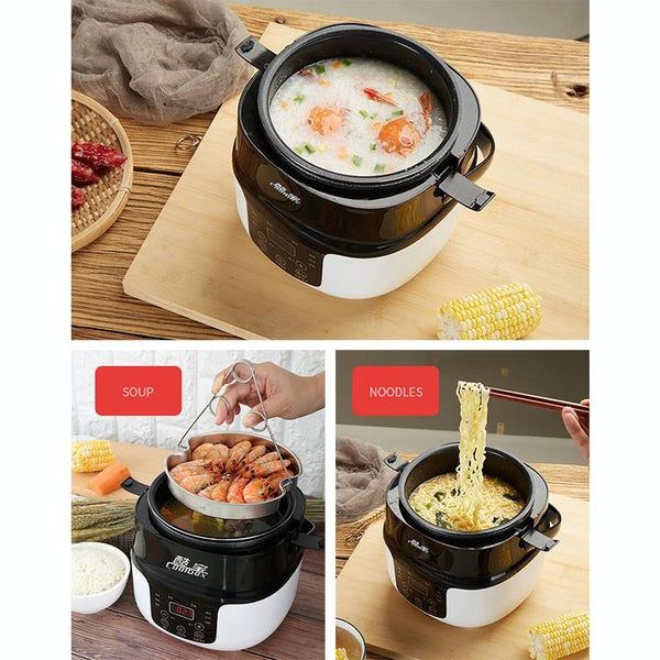3. 6 major function menus (congee/rice/soup/steaming/heat preservation/reservation), 24-hour reservation, 3D heating, 2L capacity, 80W-180W power, non-stick pan liner.
