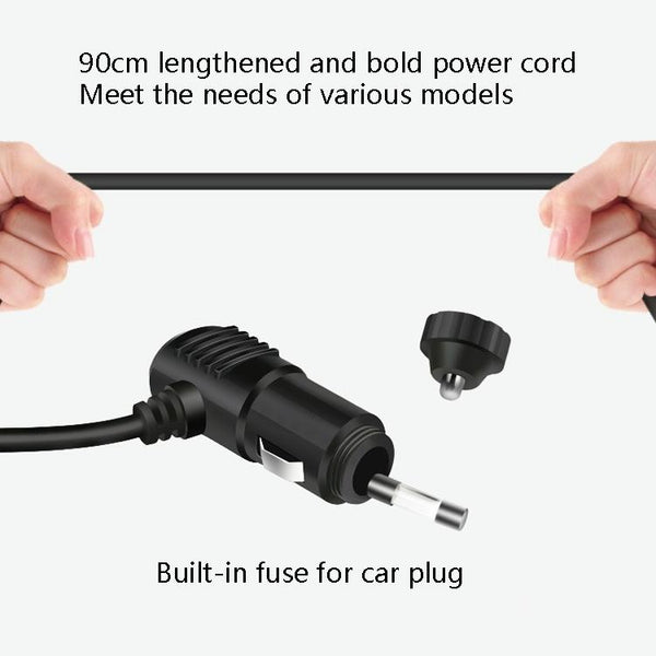 6. The 90cm lengthened and thickened power cord meets the needs of various models. The car plug has a built-in fuse