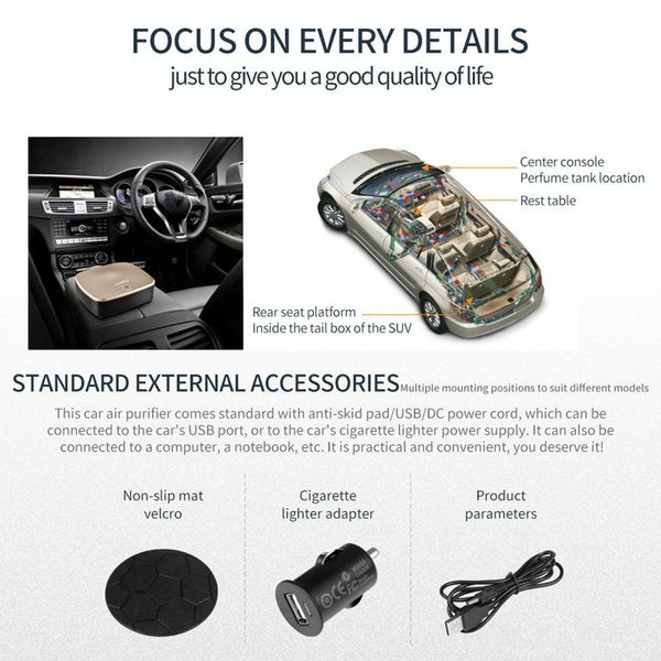 5. Packing list: air purifier x 1, anti-slip mat x 1, power cord x 1, cigarette lighter adapter x 1, filter x 1