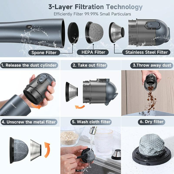1. Cordless handheld vacuum cleaner, 3-layer filtration system