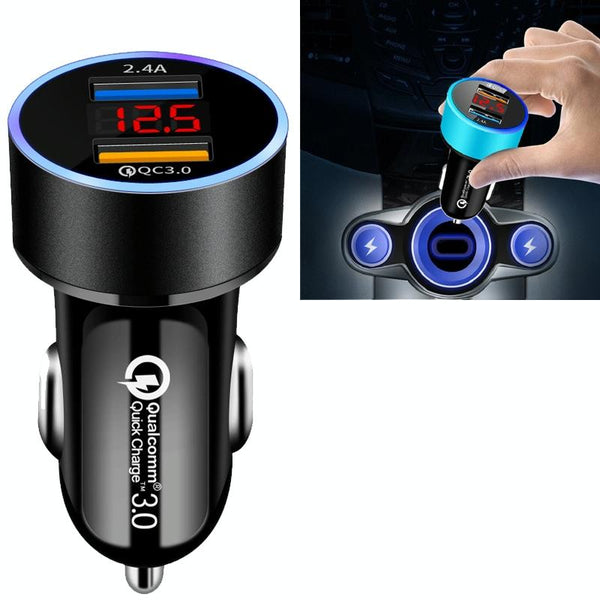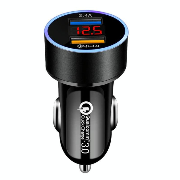 2 PCS Aluminum Ring Display Car ChargerQC3.0+2.4A Aluminum Alloy Multi-function Halo Digital Display Car Charger(Elegant Black)