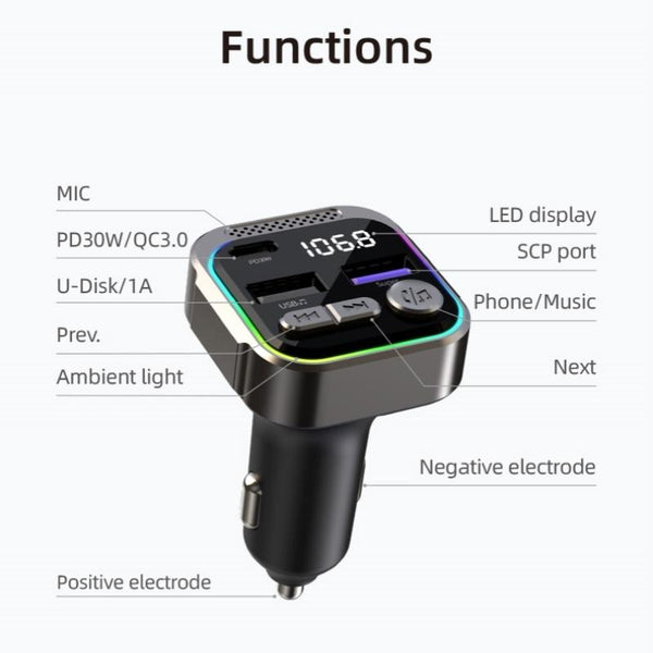 C54 PD 30W Dual USB Car Charger Alloy Car Bluetooth Adapter FM Transmitter MP3 Player