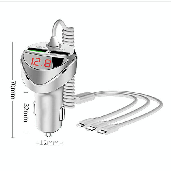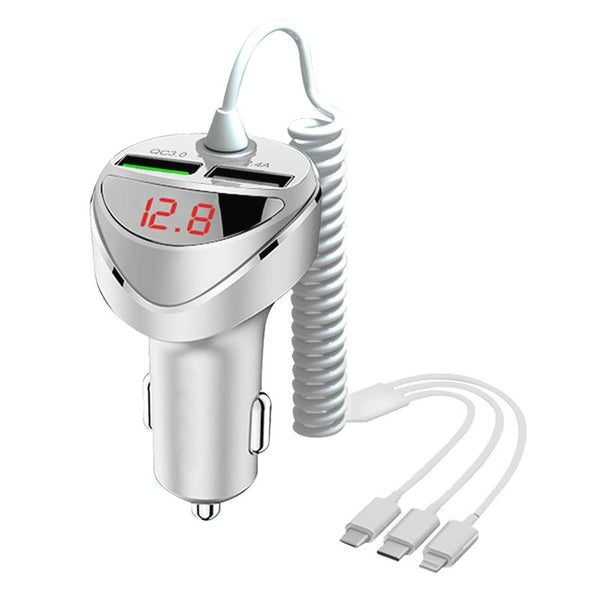C68 LED Digital Display QC3.0 Fast Car Charger 3 in 1 with Spring Cable (Silver)