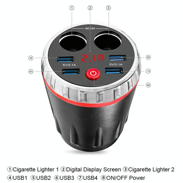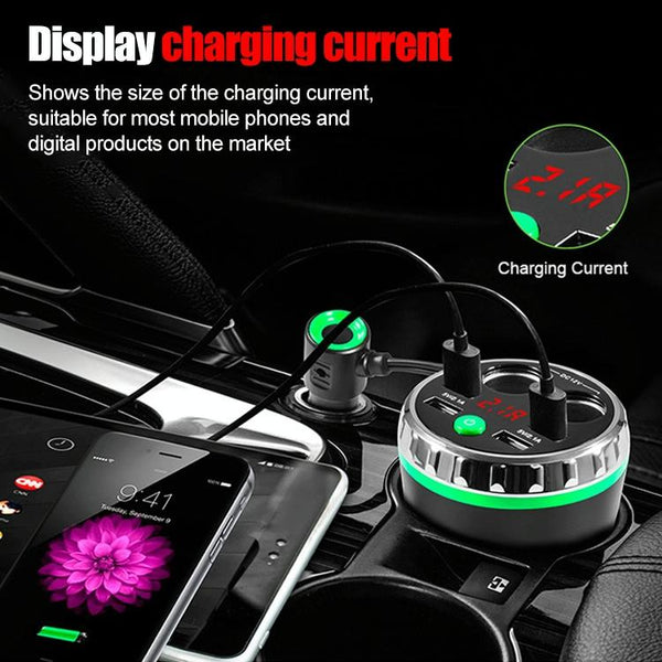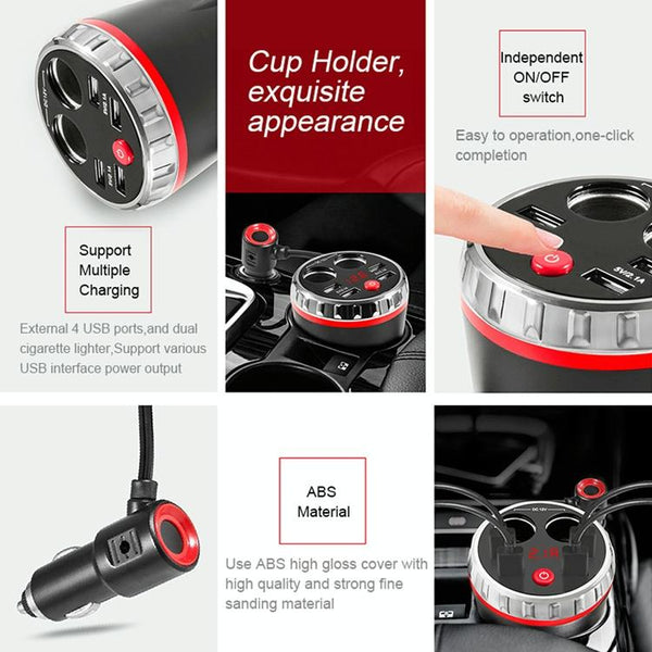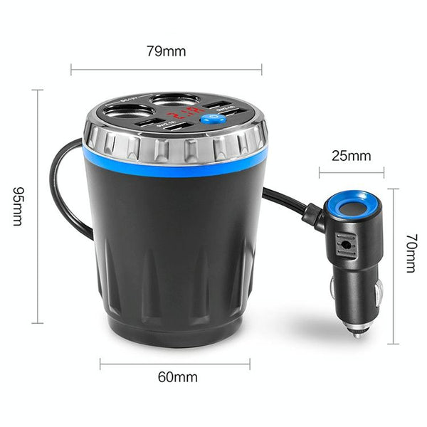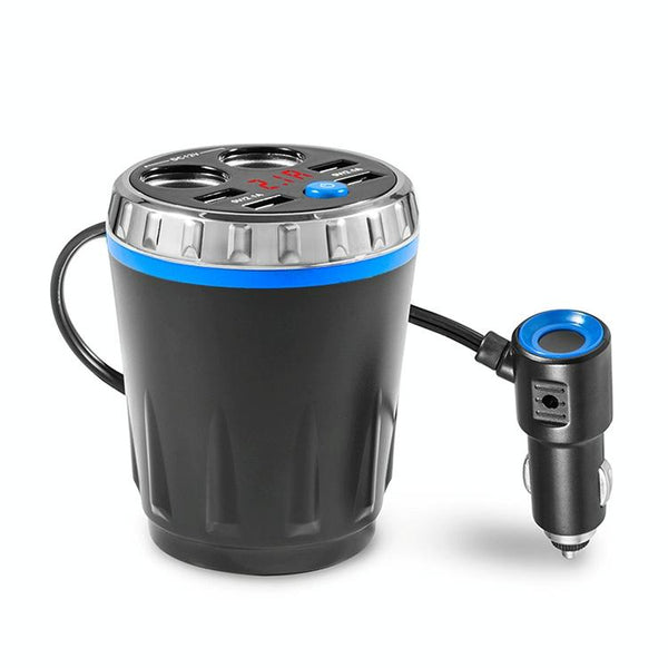 Cup Holder Car Charger Dual Cigarette Lighter 4USB Ports Charger Car MP3 Player (Blue)