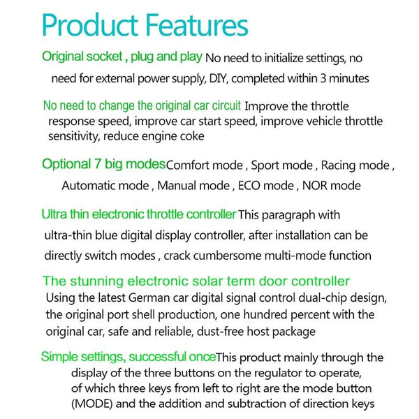4. 5 modes: Comfort mode / Sport mode / Racing mode / Economy mode / Original car mode