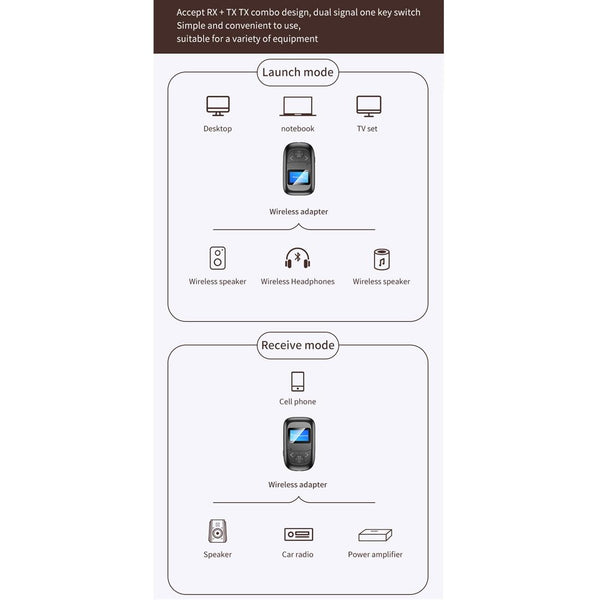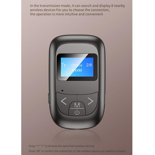1. Function: bluetooth audio receiving and transmitting combo, LCD screen display, support hands-free call