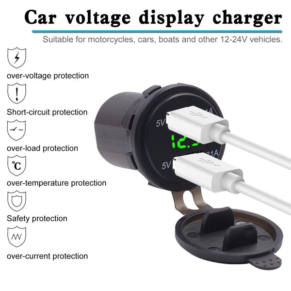 Universal Car Dual Port USB Charger Power Outlet Adapter 4.2A 5V IP66 with LED Digital Voltmeter + 60cm Cable(Green Light)