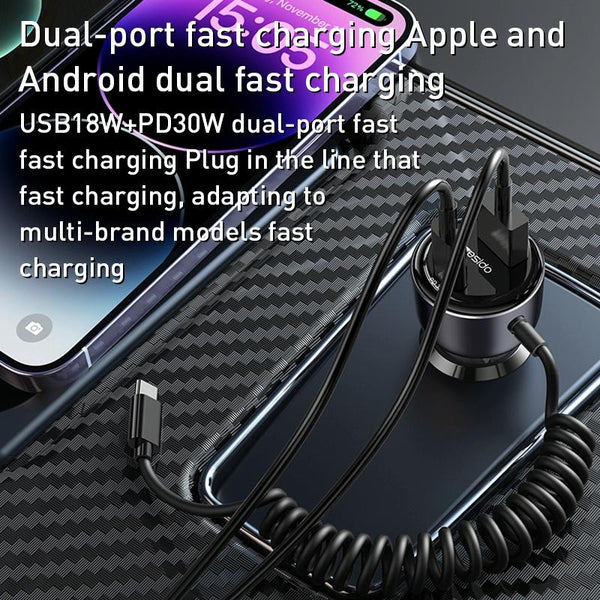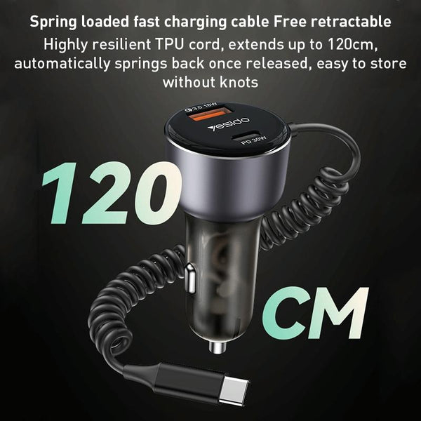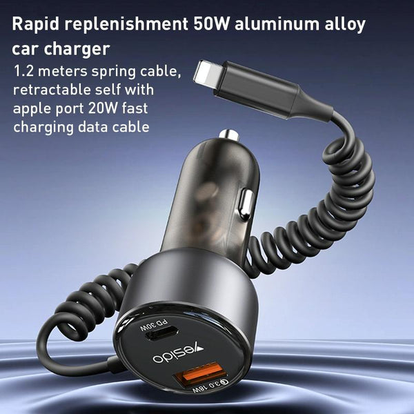 Yesido Y57 50W PD + QC3.0 Dual Port Car Charger with 8 Pin Spring Data Cable